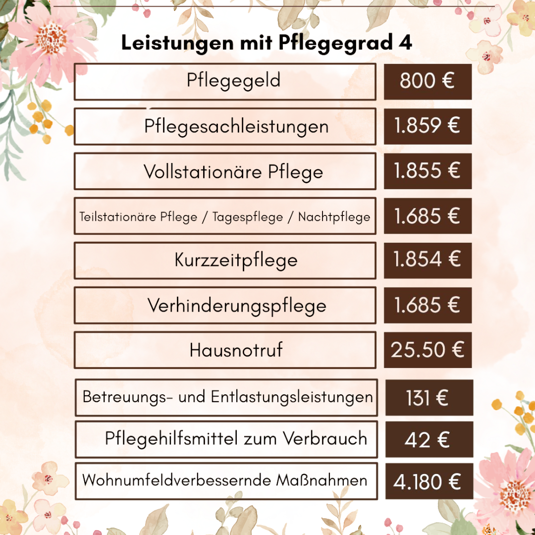 Um die aufwendige Pflege zu finanzieren, stellt die Pflegekasse bei Pflegegrad 4 deutlich erhöhte Budgets bereit: